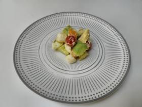 Coupez l'avocat en deux, ôtez le noyau et la peu et détaillez en