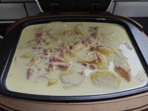 Placer une couche de rondelle de pomme de terre au fond de votre plat a four , puis versez une couche de votre préparation