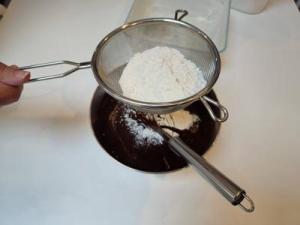 Tamisez la farine au dessus et melangez jusqu'à obtenir une préparation bien homogène.