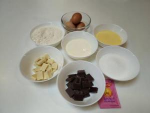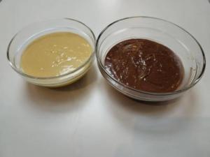 dans une préparation ajouter 60 gr de beurre fondue et le chocolat blanc fondu et dans la deuxieme préparation ajouter 60 gr de beuure fondu et le chocolat noir fondu